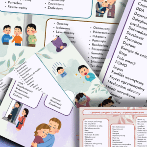 32 plansze tematyczne ze słowami, które mogą ułatwić opis doświadczeń życiowych, emocji, poczuć, trudności. Dotyczą pracy, związków, emocji, schematów emocjonalnych, myślenia, dzieciństwa, itp. Dla psychoterapeutów, psychologów, coachów.